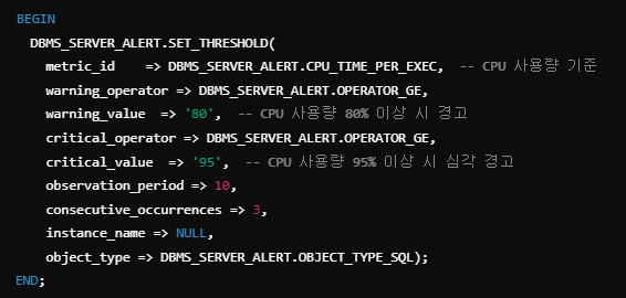 Oracle에서는 DBMS_SERVER_ALERT 패키지를 사용하여 특정 임계치를 초과하면 자동으로 경고를 생성할 수 있다.