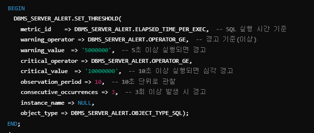이 설정을 통해 SQL 실행 시간이 길어질 경우 즉시 경고가 발생하도록 구성할 수 있다.